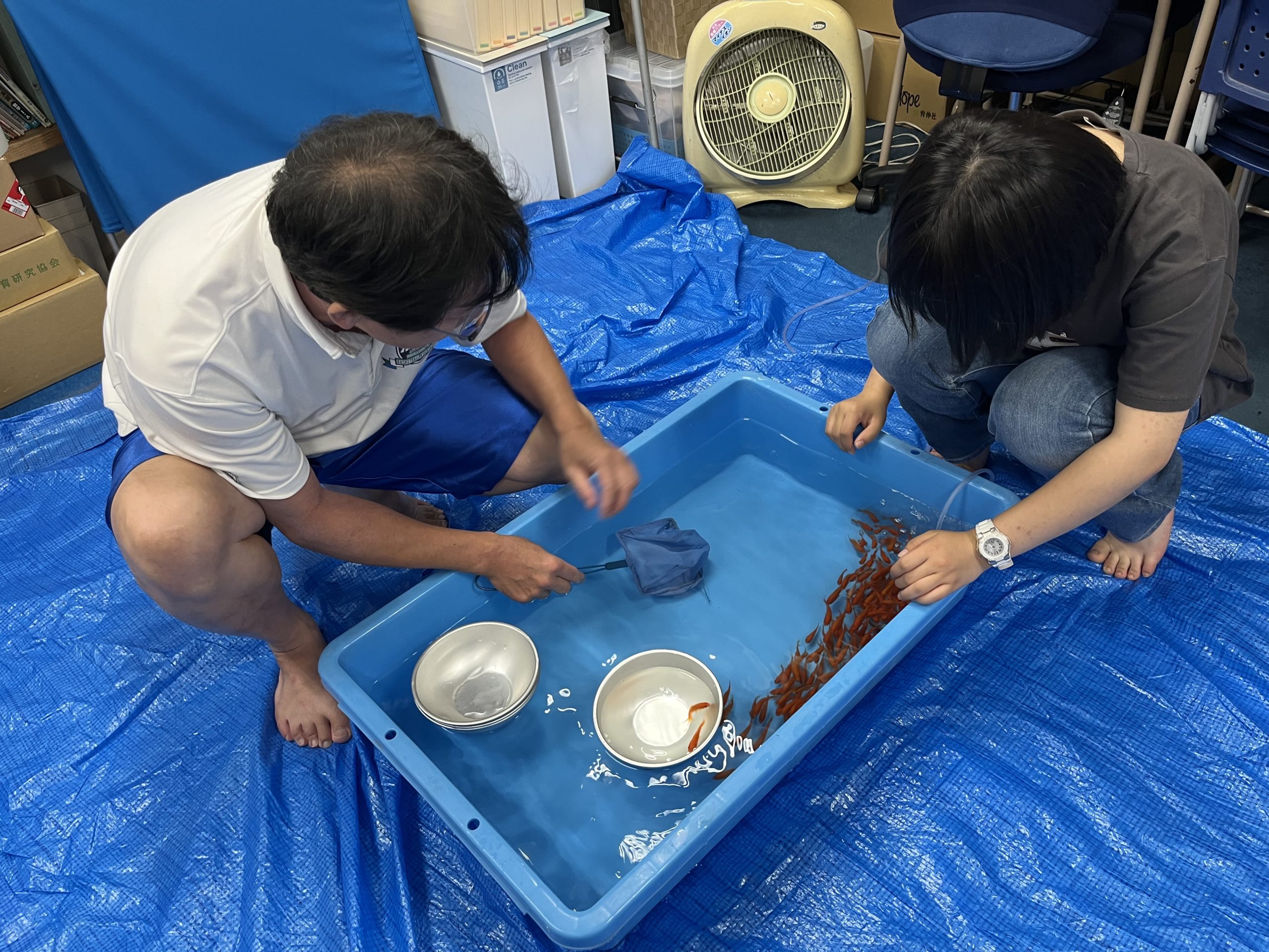 猛暑の中、教室で開催したドルフィン金魚すくい大会ですが、大勢の生徒さんや保護者の方にお集まりいただき大盛況でした。