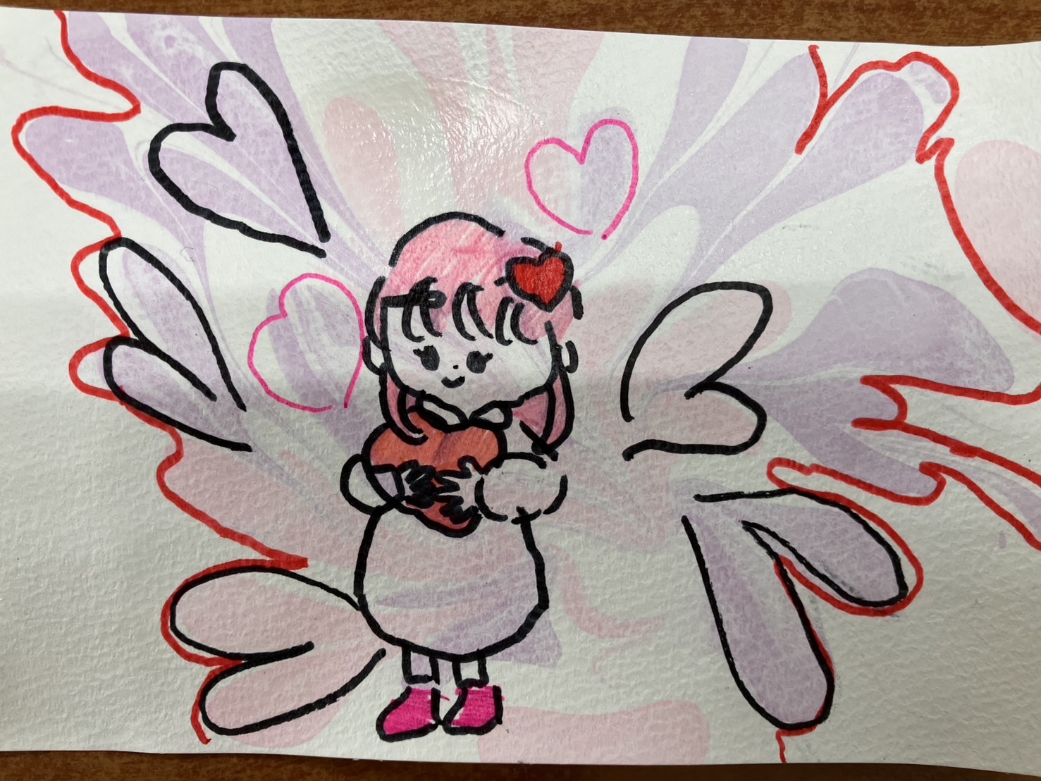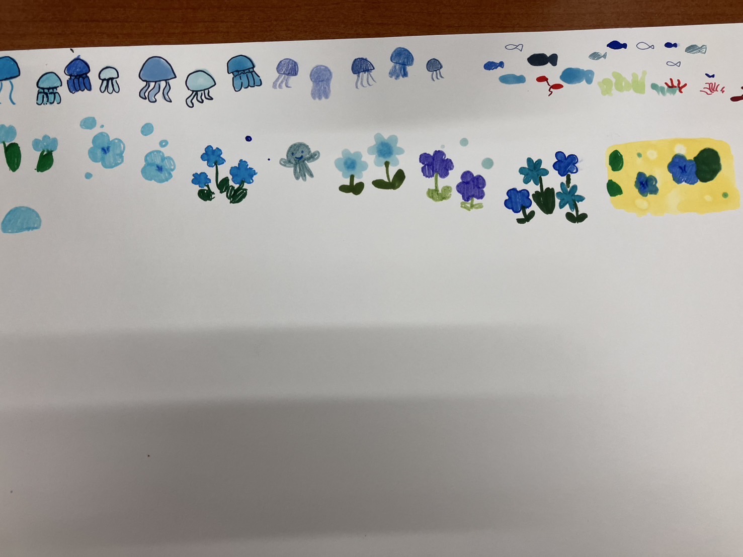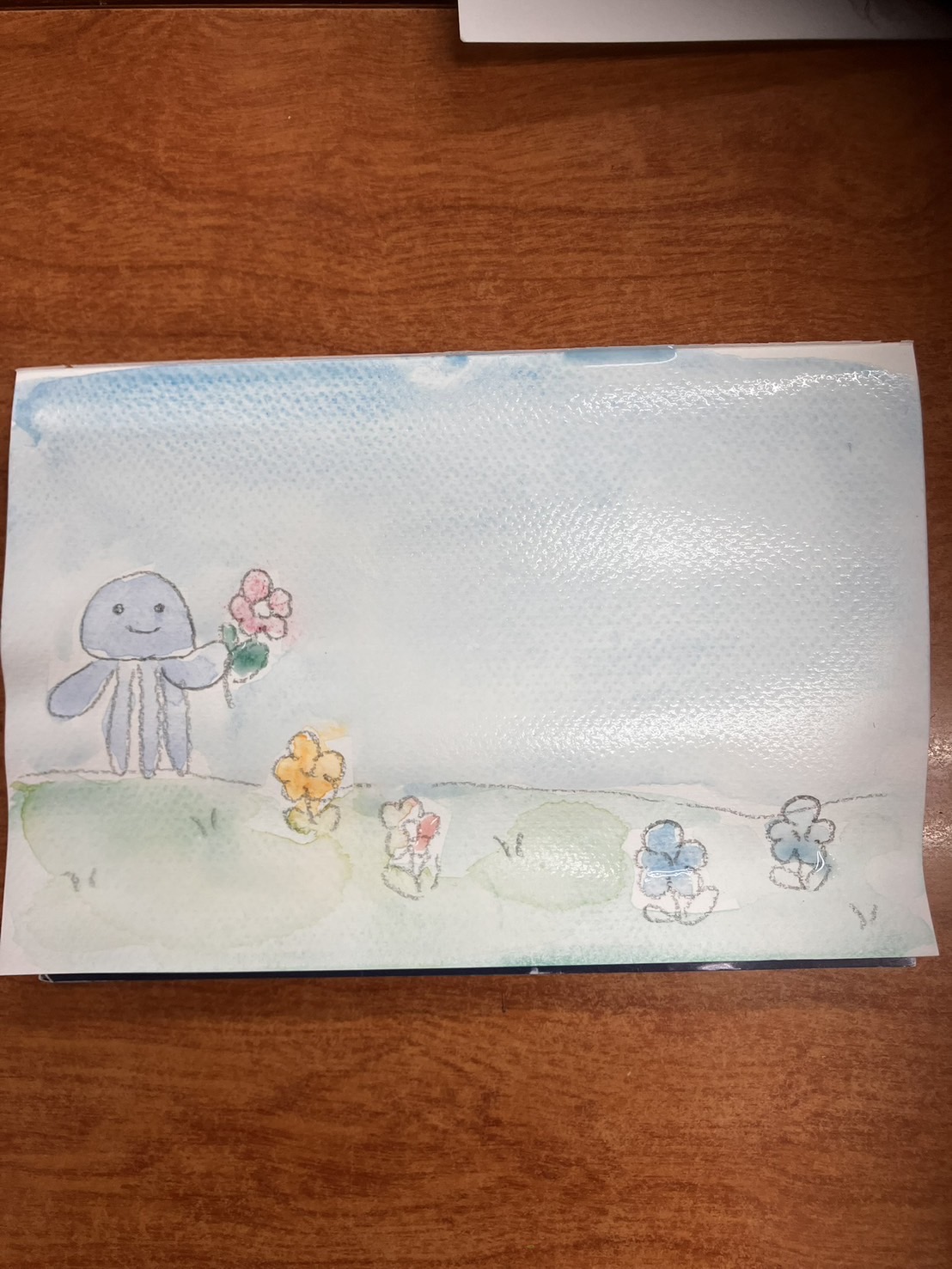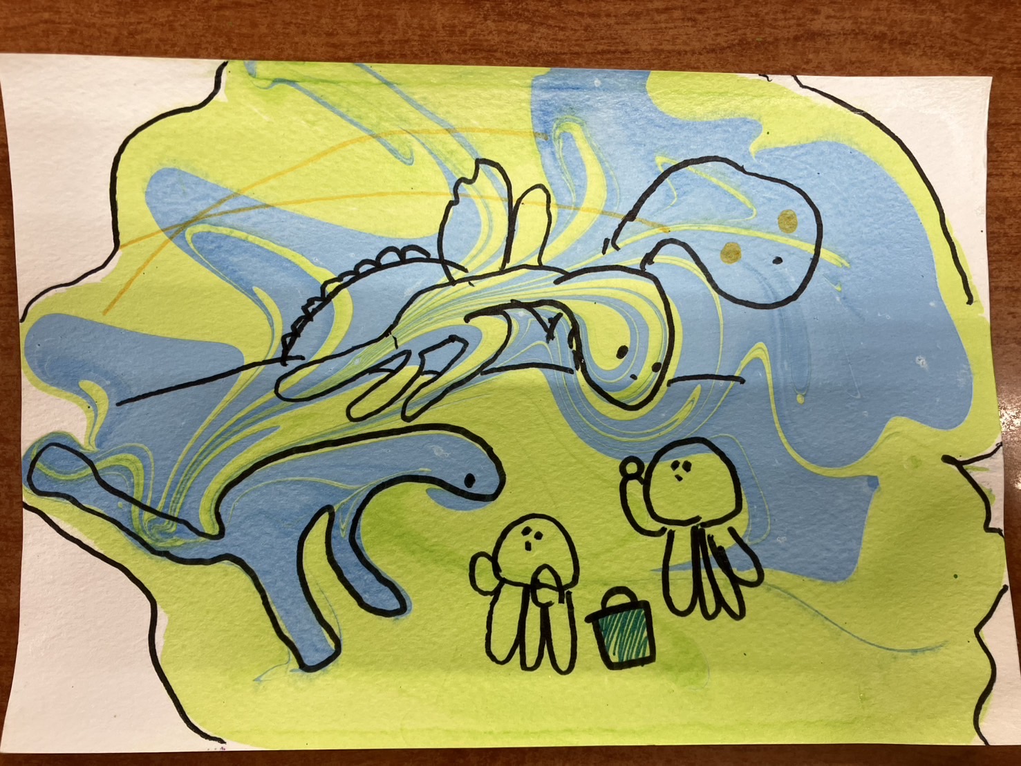 前回作成したマーブルにペンで描き足し。200年後の世界。見たこともない生き物にクラゲが餌をあげているところ。AIが世界を牛耳って平和な世の中になってるそうです…