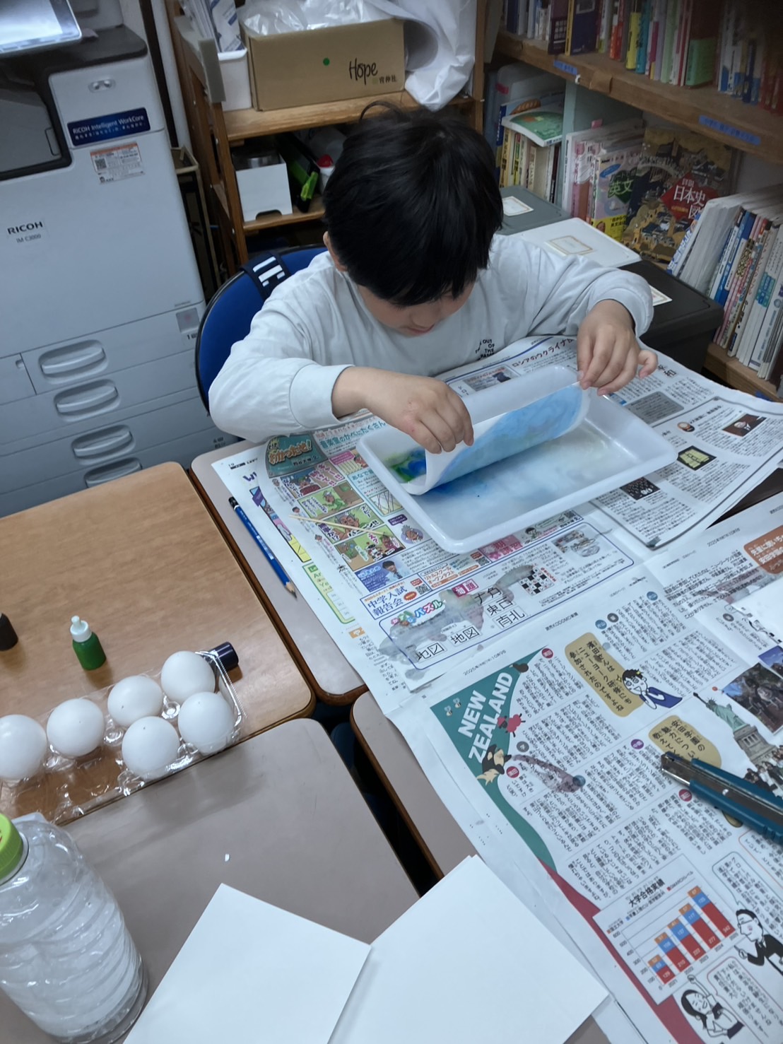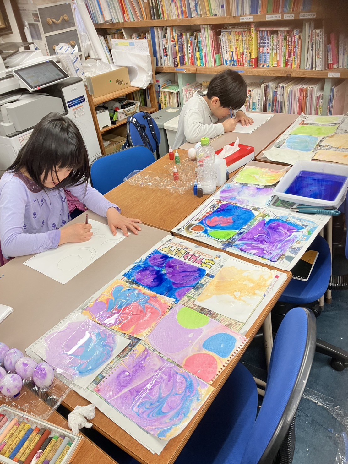 まず2人はマーブリング体験からスタート。水面に色を落として、ゆらゆら揺らして…できあがる模様は毎回ちがうから、何度やっても楽しい!イースターエッグもマーブリングで仕上げて、たくさんの作品が生まれました。 (…が、次々と作品が生まれるスピードに大人の手が追いつかず、記録画像がありません…すみません🙏💦)