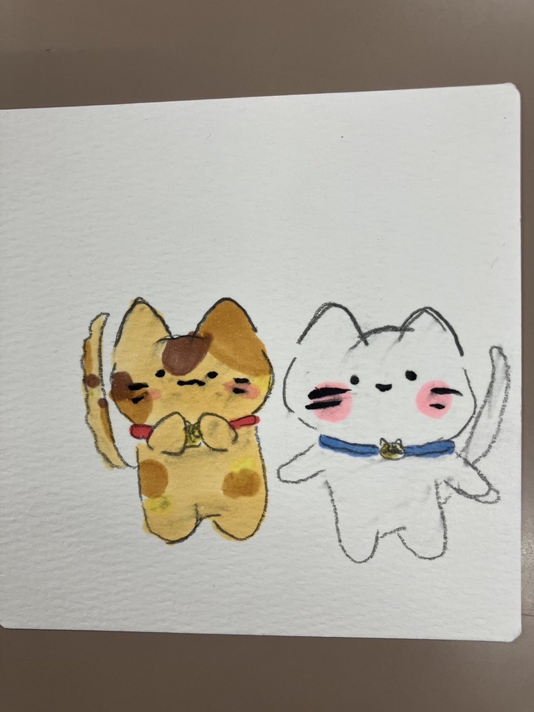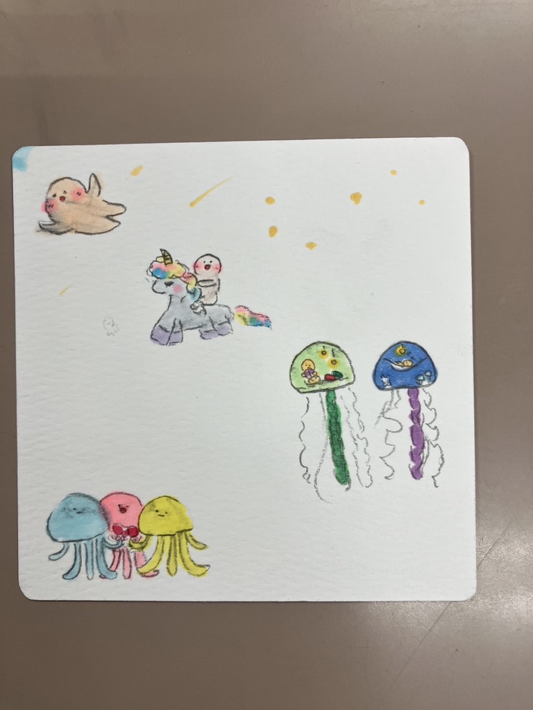 もうひとりの生徒さんも「私も描きたい!」と画用紙に向かいましたが、大きな紙だとなかなか筆が進まず…。小さな水彩紙に切り替えたところ、得意の細やかなタッチでかわいいキャラクターたちが次々と誕生。猫やくらげなど、繊細で色鮮やかな作品に仕上がりました。小さな色面での混色はお手のもの、という感じです。