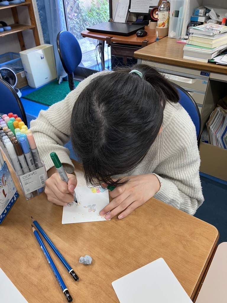 ひとりの生徒さんは、大きめの画用紙いっぱいにトトロの世界を描きました。グレーの毛並みを表現するのに、黄色や紺、グリーンなど何色もの絵の具を混ぜ合わせて、こだわりの色づくり。混色の過程そのものを楽しんでいる様子が印象的でした。大作はまだ制作途中、棚の上でただいま乾燥中です。完成が楽しみですね。